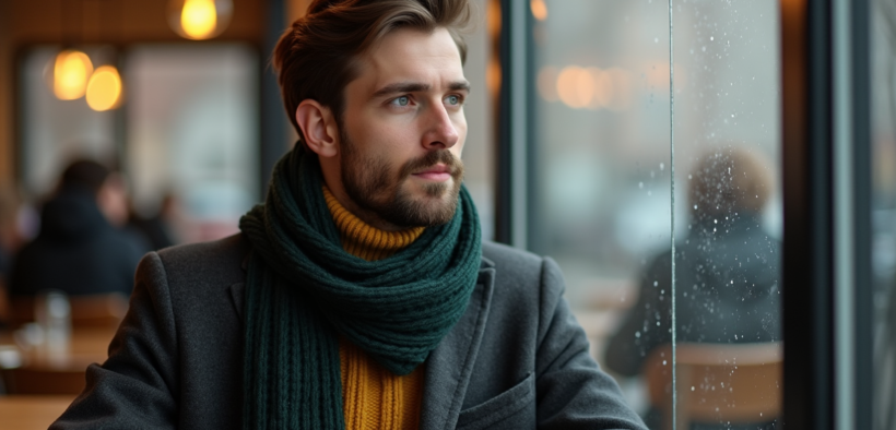 - Col roulé gris anthracite sous une veste noire, écharpe vert émeraude ou violet royal : l’équilibre subtil pour un effet distinctif, pointu mais jamais trop chargé.