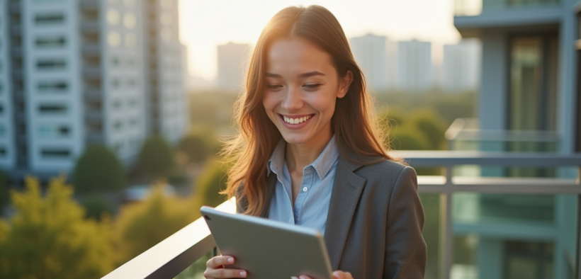 Jeune femme souriante avec tablette affichant un graphique financier