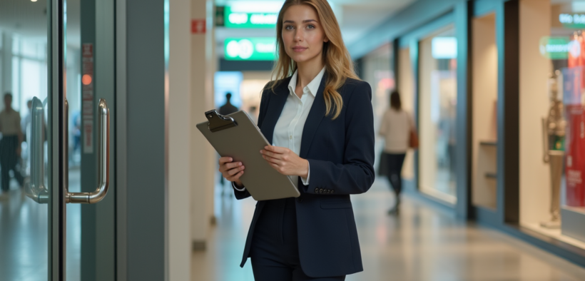 Jeune femme d affaires près d une sortie de secours dans un centre commercial