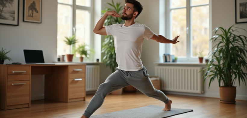Jardinage d’intérieur : Même sans jardin, on peut inviter la nature chez soi. Semer quelques graines, bouturer une plante, créer un mini-potager sur le rebord d’une fenêtre : le jardinage structure le temps, apaise l’esprit et donne une nouvelle dimension à son espace de vie.Homme pratique le yoga dans un bureau lumineux à la maison