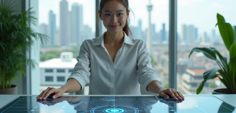 Jeune femme devant un tableau de bord avec ville solaire futuriste