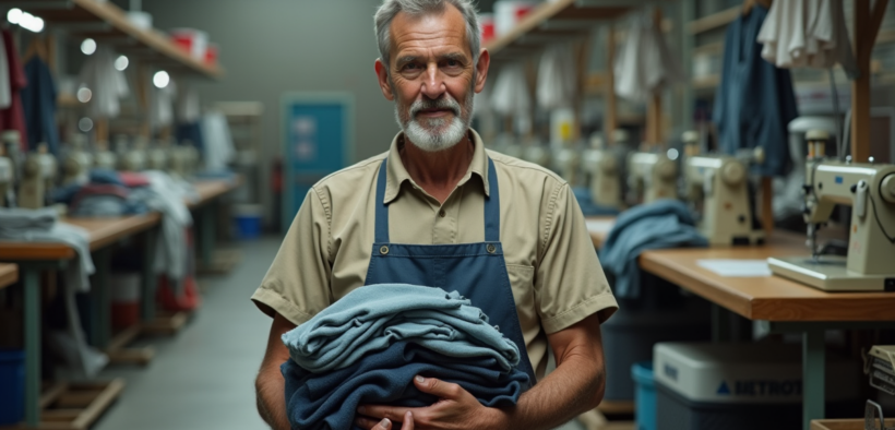 Ouvrier dans une usine de textile tenant un lot de vêtements