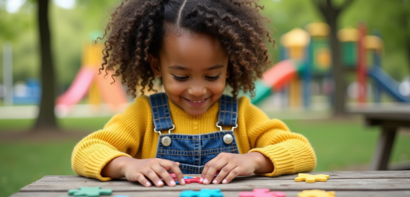 Fille de six ans résolvant un puzzle coloré dans un parc