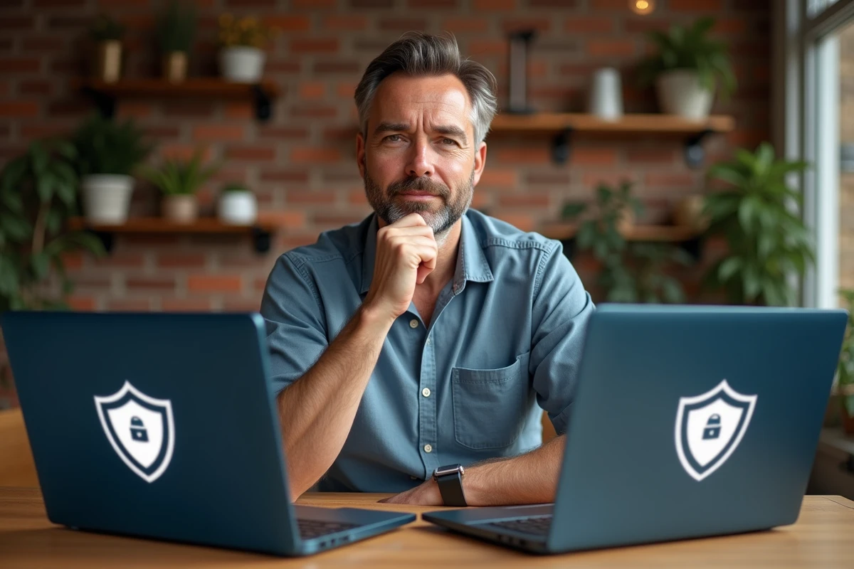 Homme comparant deux ordinateurs avec logos VPN et WireGuard