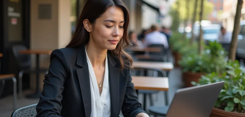 Jeune femme investisseuse analysant des graphiques au café