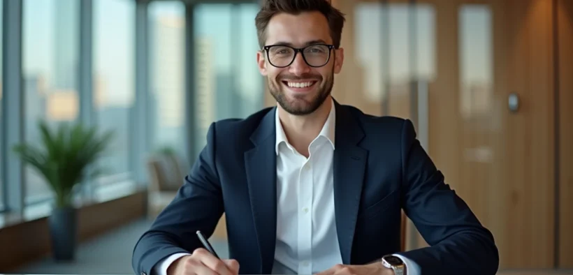 Jeune professionnel signant un contrat de prêt dans un bureau moderne
