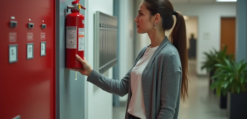 Jeune femme contrôlant un extincteur dans un couloir moderne