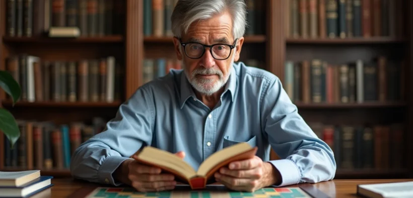 Homme âgé consultant un dictionnaire Scrabble dans une bibliothèque
