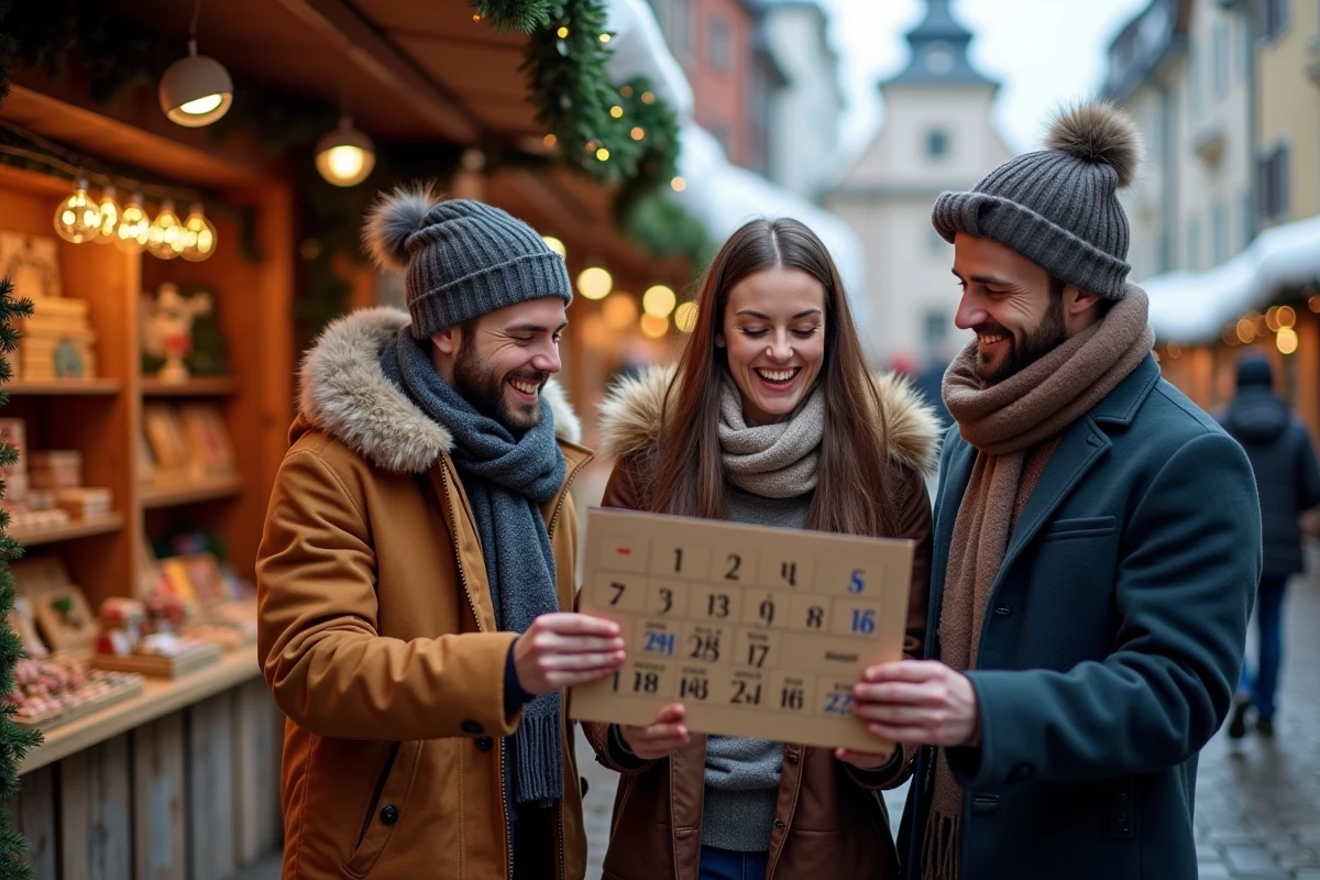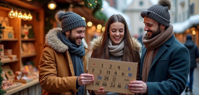 Trois amis riant devant un marché de Noël avec calendrier de l