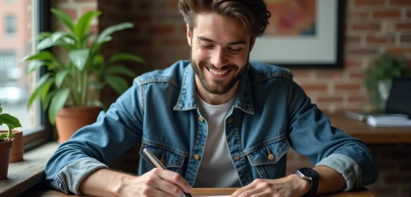 Jeune homme pressant un timbre sur une lettre dans son appartement