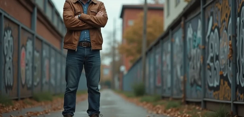 Homme en jeans et veste en cuir dans une rue urbaine