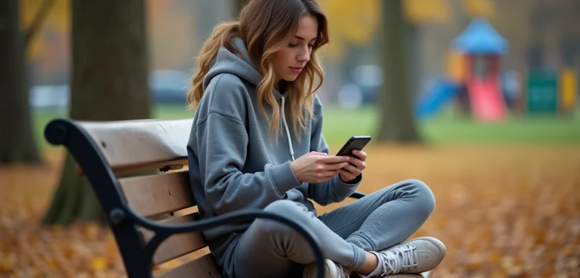 Jeune femme assise dans un parc jouant à Clash of Clans sur smartphone