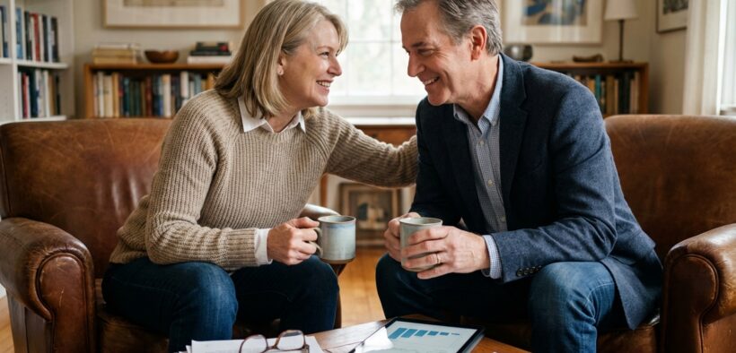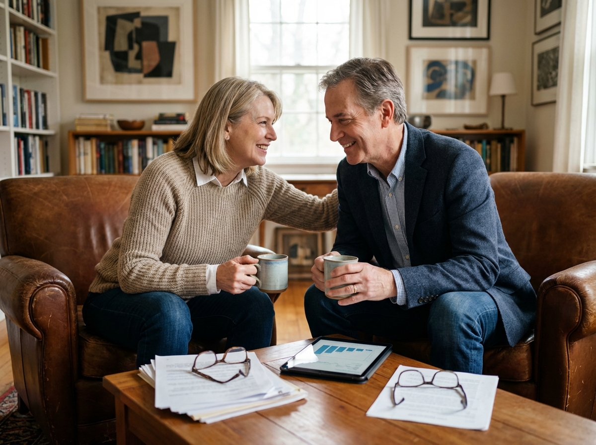 Couple de seniors discutant dans un salon chaleureux