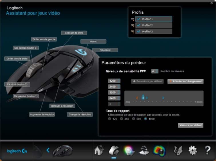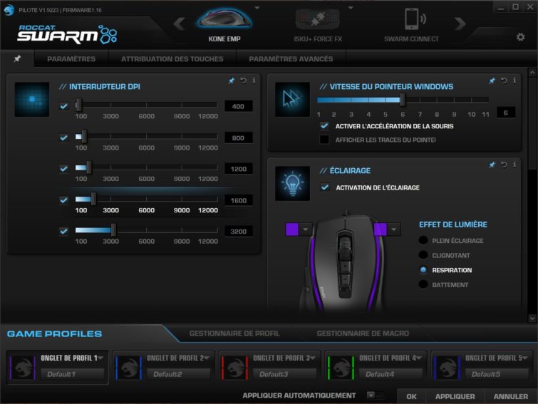 Le logiciel compagnon fait désormais toute la différence. Si toutes les souris s’installent automatiquement sous Windows, seules les applications dédiées permettent d’exploiter la gestion avancée des profils, de la sensibilité, de l’éclairage RGB ou des macros. Certains logiciels sont très légers, d’autres bien plus volumineux sans offrir davantage de fonctionnalités. L’absence d’un véritable outil de personnalisation, comme sur la HyperX Pulsefire FPS, est pénalisante. Notez que l’ergonomie du logiciel varie beaucoup selon la marque : chez PNY, tout tient en une page ; chez Razer, il faut jongler avec plusieurs onglets ; Roccat propose un système de favoris très pratique. Logitech et SteelSeries figurent aussi parmi les références côté interface.