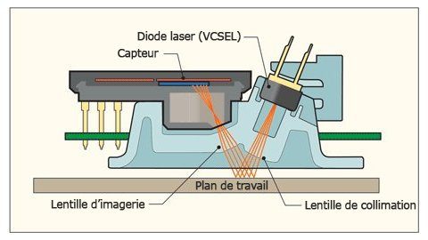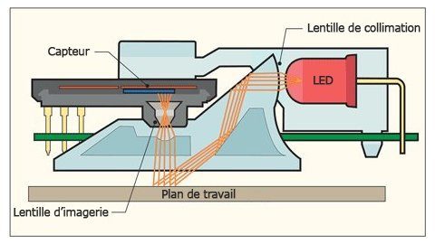 À gauche, un schéma de capteur optique avec LED, à droite, un capteur laser.