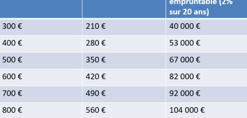 Il y a une règle simple : le loyer doit dépasser la mensualité, afin de couvrir tous les frais. Viser un différentiel de 20 à 30 % est un bon repère, à ajuster selon le régime fiscal. Voici un repère visuel pour estimer le montant maximal du projet selon le loyer et une mensualité correspondant à 70 % du montant perçu :