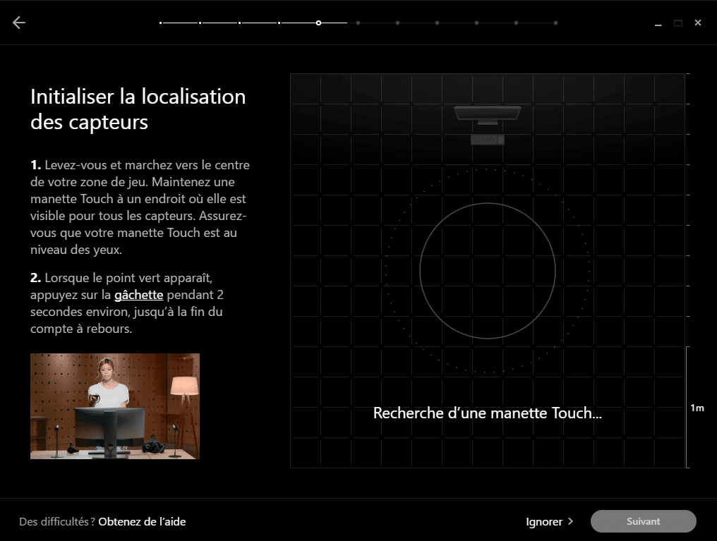 Lorsque tout est bien branché, l’application vous demande d’ajuster votre taille et de configurer les capteurs Oculus Rift. Dégagez la zone de jeu, enlevez chaises et tables, puis équipez-vous d’un contrôleur Oculus Touch pour localiser les capteurs et les positionner correctement.