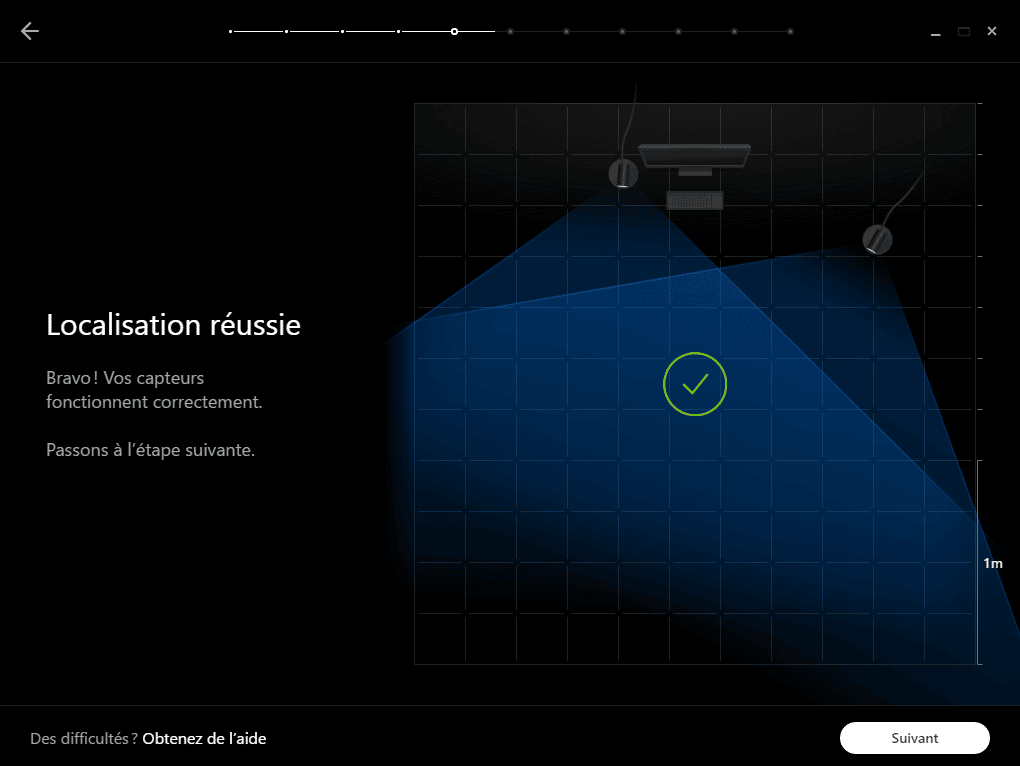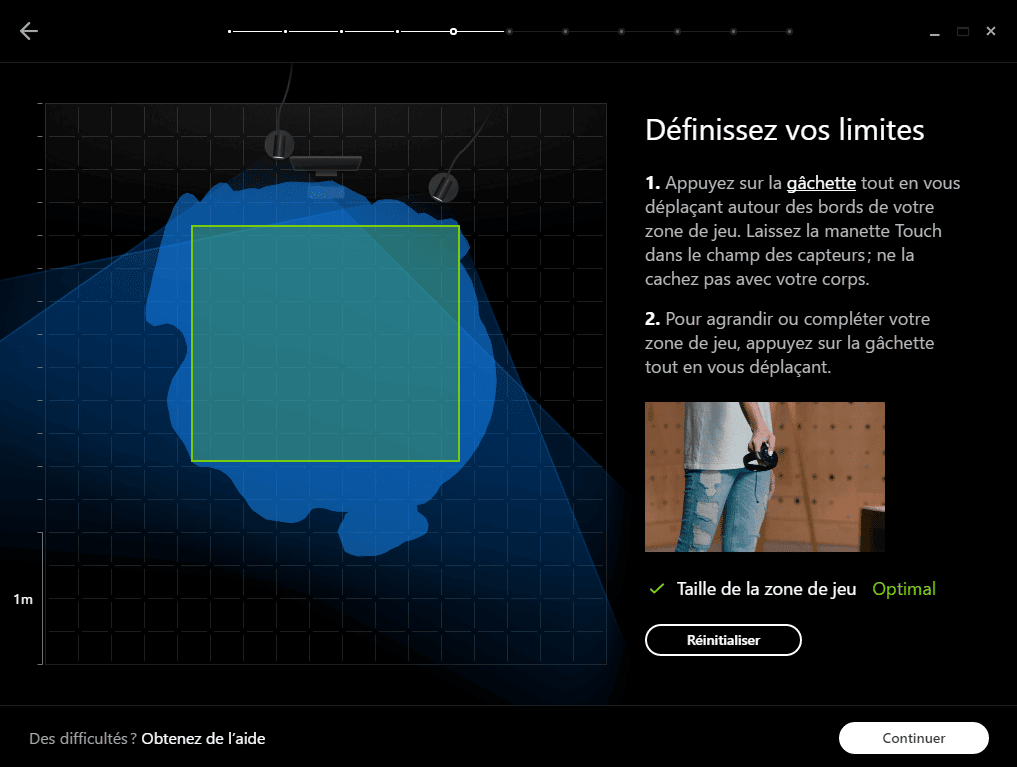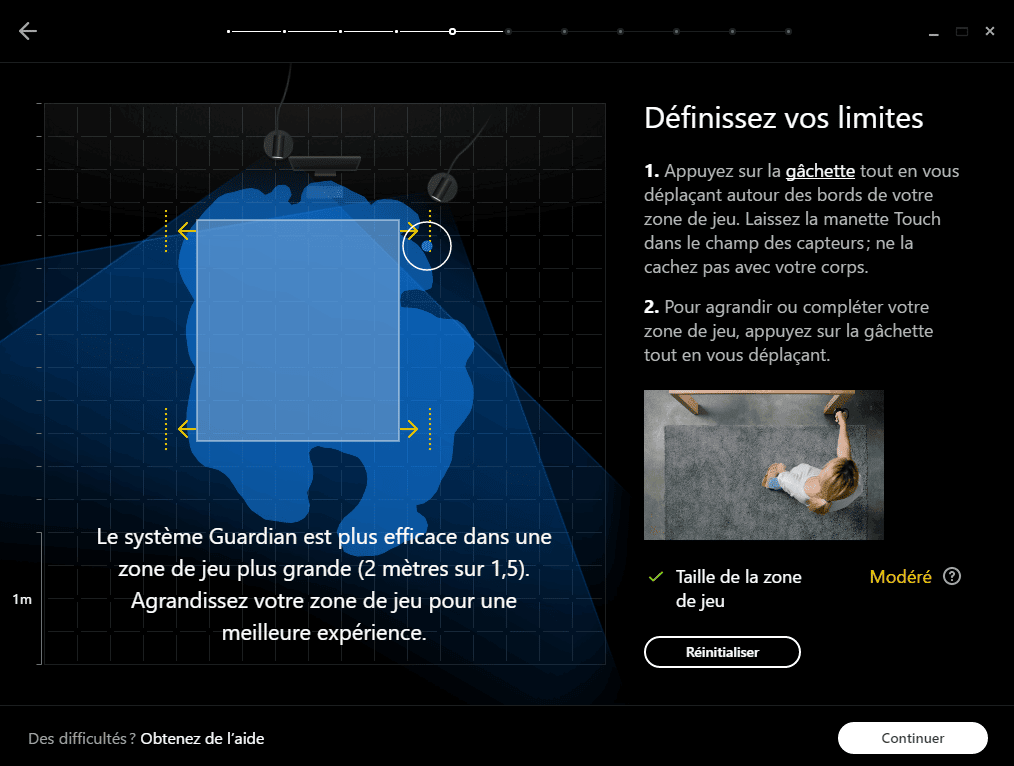 Après avoir placé les capteurs, vous allez définir l’espace de jeu à l’aide du système Guardian. Le logiciel vous invite à vous déplacer avec une manette tactile pour tracer la zone utilisable. Plus votre périmètre est large, plus vous serez à l’aise dans vos mouvements, à condition de rester dans le champ des capteurs. Lorsque la zone est correcte mais peut être agrandie, des flèches jaunes s’affichent et la mention « Taille de la zone de jeu, Modérée » apparaît. Revenez sur ces zones pour les élargir et gagner en liberté de mouvement.