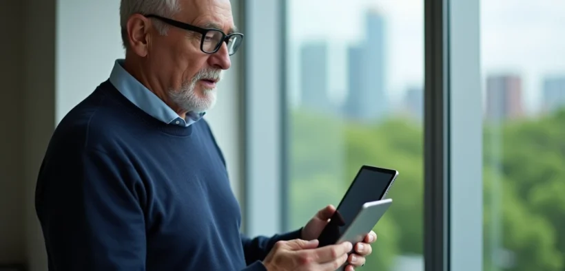 Homme comparant deux tablettes dans un bureau moderne