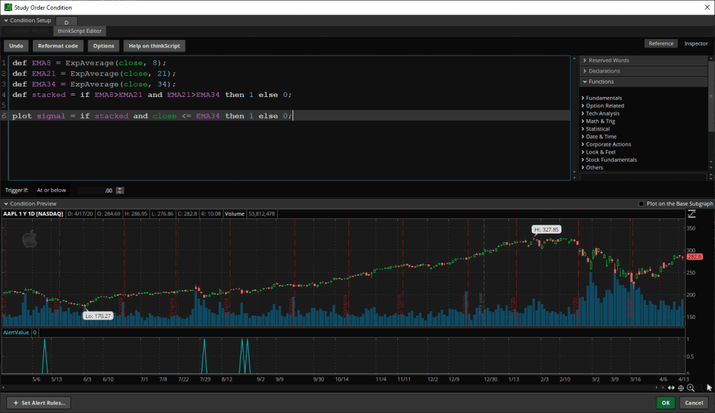 def EMA8 = ExpAverage(close, 8); def EMA21 = ExpAverage(close, 21); def EMA34 = ExpAverage(close, 34); def stacked = if EMA8 > EMA21 and EMA21 > EMA34 then 1 else 0; plot signal = if stacked and close