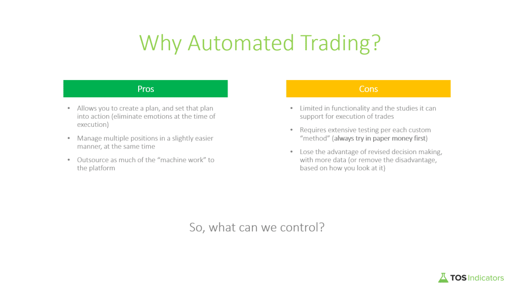 Pour le 16e épisode de « How to ThinkScript », nous allons changer de vitesse et explorer l’écriture de code ThinkScript pour atteindre le trading automatisé dans ThinkOrSwim, autant que possible.