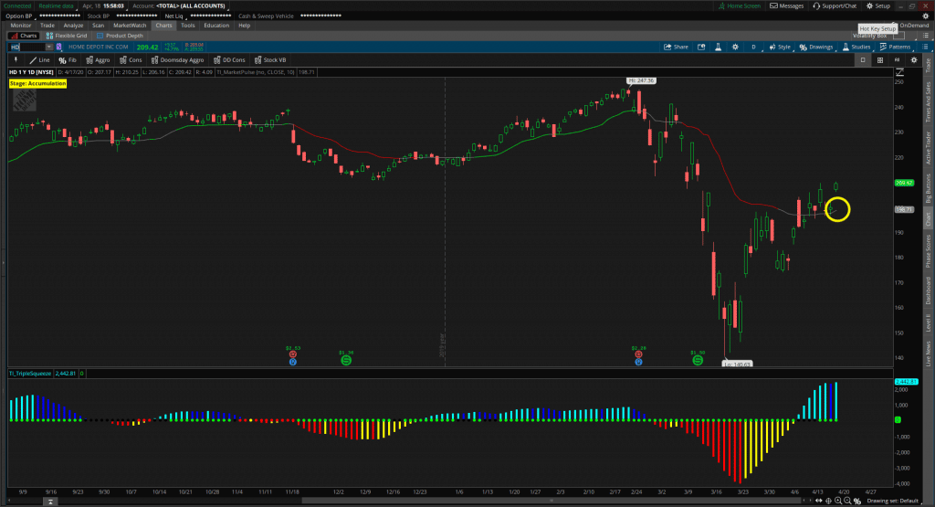 Supposons que vous identifiiez une phase de consolidation sur Home Depot (HD) : l’objectif ici est de vendre un Iron Condor dès que le prix évolue entre 195 $ et 200 $.