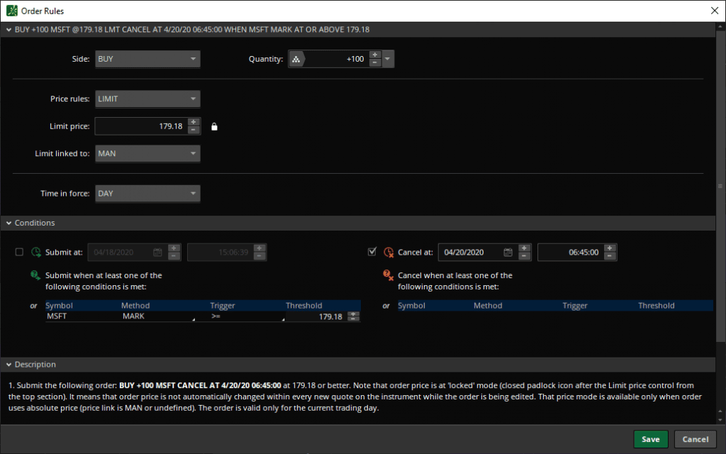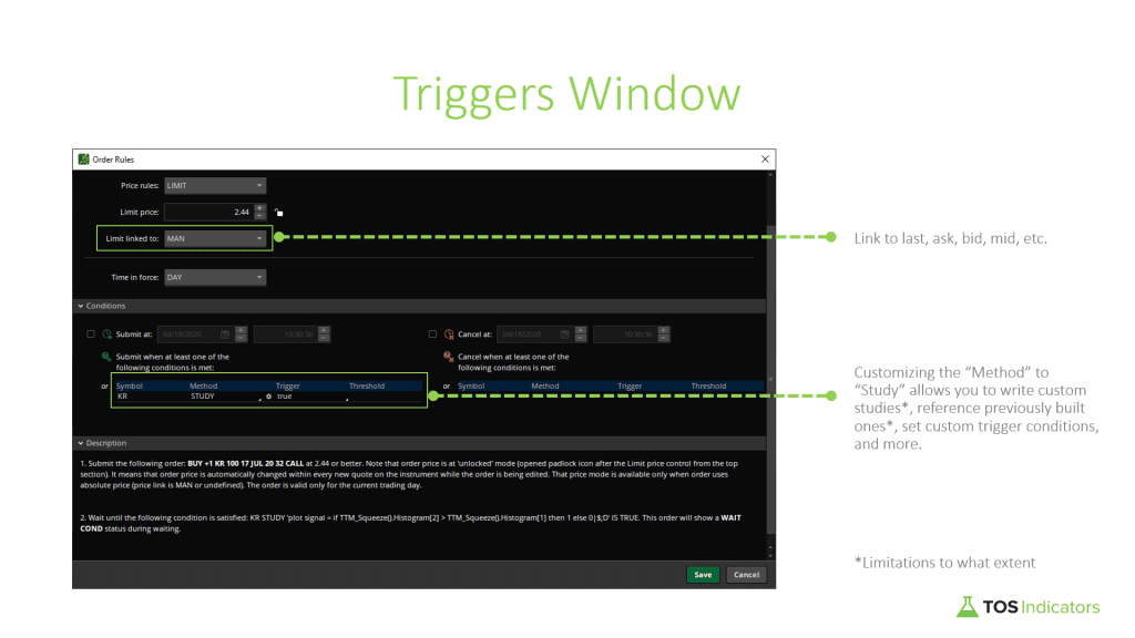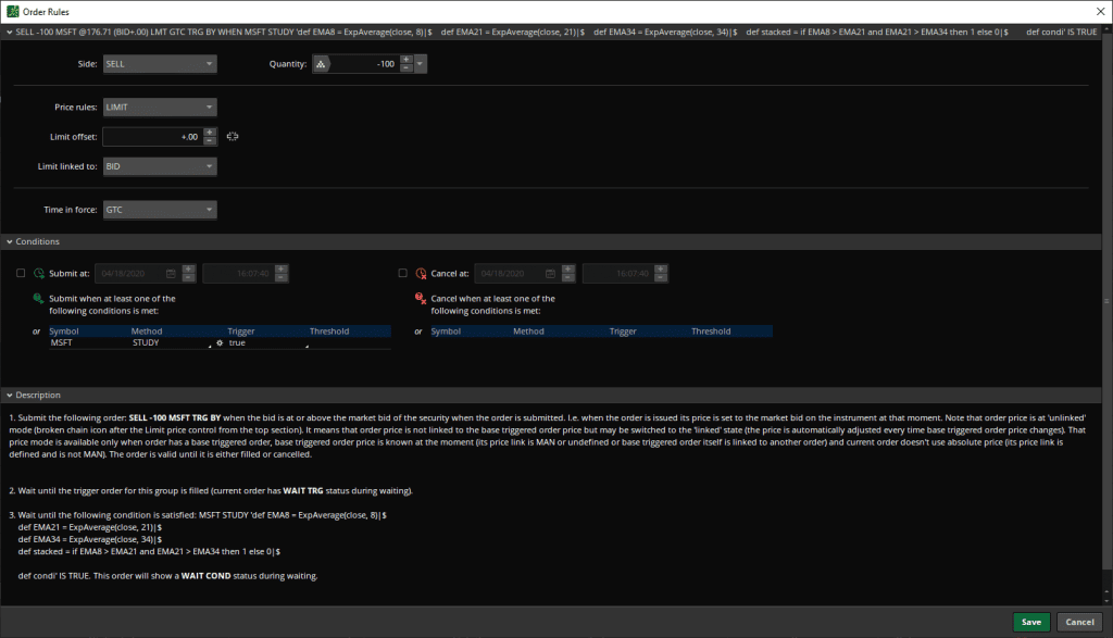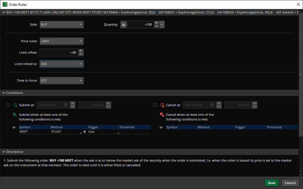 • Conditions : personnalisez la méthode en optant pour une étude, puis saisissez votre code ThinkScript ou référencez une étude préalable pour créer vos propres conditions d’automatisation.