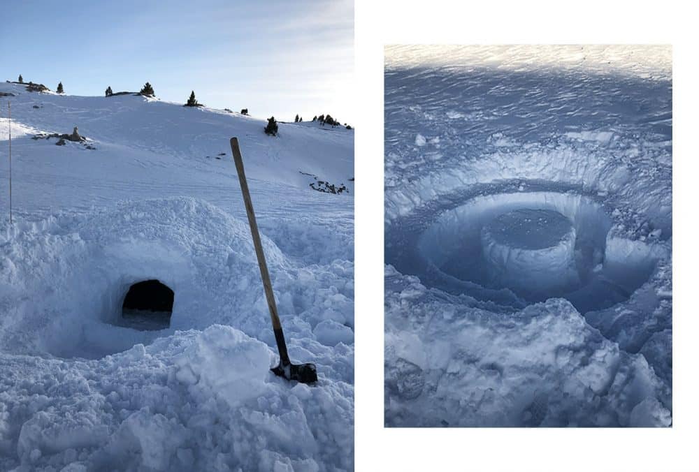 Au détour d’une sortie en ski de rando dans le Vercors, nous avons croisé un petit groupe affairé à leur abri pour la nuit. Leur astuce : empiler leurs sacs à dos, les recouvrir d’une bonne épaisseur de neige, patienter que la masse se tasse, puis retirer les sacs pour dégager l’intérieur. L’espace ainsi formé leur a permis d’aménager, non sans malice, une terrasse avec banc et table pour le repas du soir.