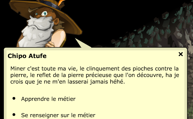 Petite piqûre de rappel : sur Dofus 1.29, on ne peut choisir que 3 métiers. Si votre choix est arrêté, n’allez surtout pas à Incarnam ! Foncez sur Astrub et trouvez Chipo Atufe dans la mine d’Astrub (9, -23). N’oubliez pas : il faut équiper une pioche avant de se mettre à la tâche et récolter vos premiers minerais.