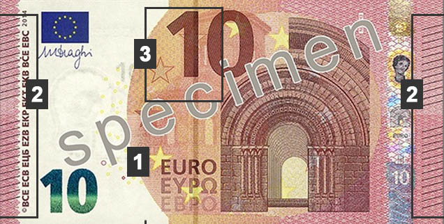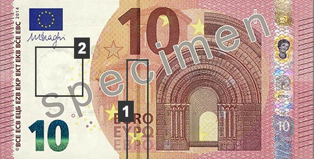- Le chiffre « 10 » et la vignette centrale présentent eux aussi une sensation de relief, un repère tactile que les faux billets évitent rarement avec succès.