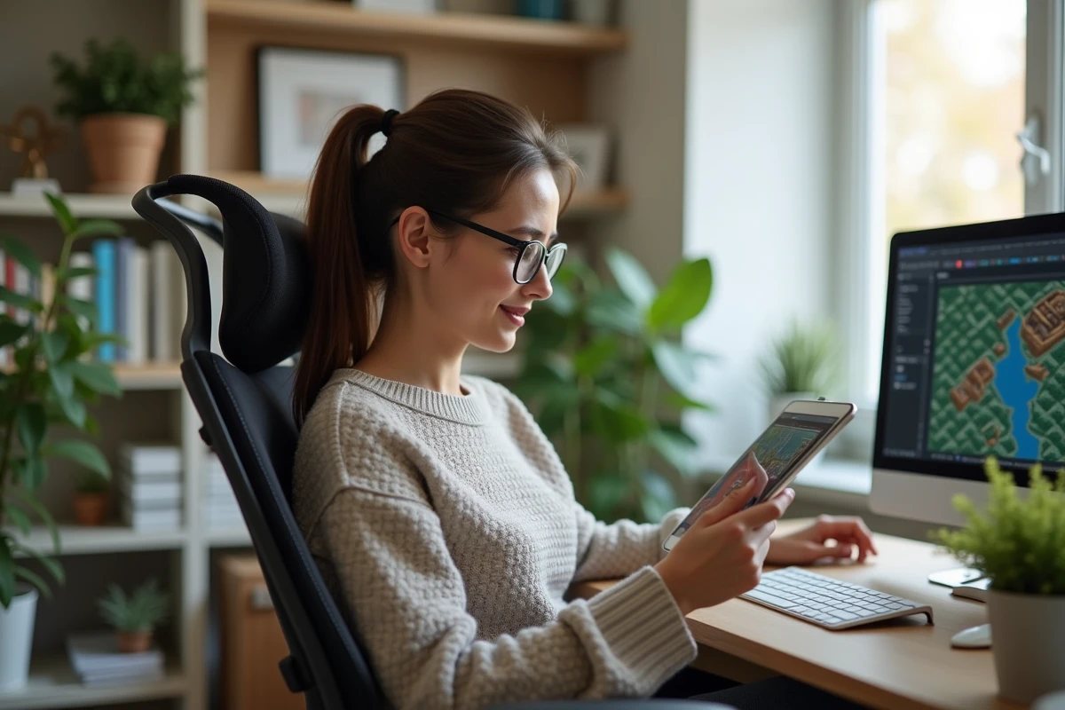 Femme dans un bureau moderne analysant Clash of Clans sur tablette