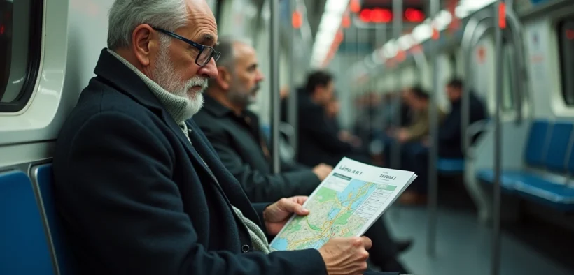 Homme âgé étudiant la carte du métro dans le train