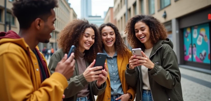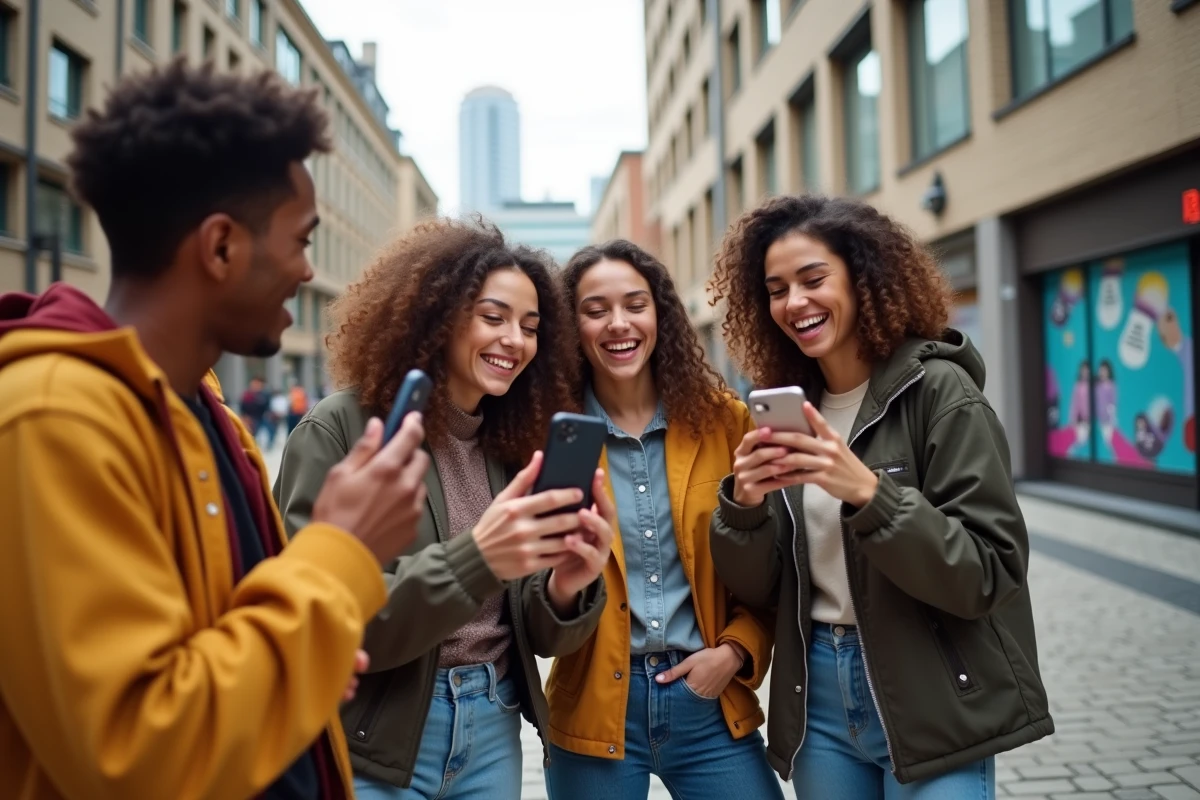 Groupe de jeunes enregistrant une vidéo TikTok en ville