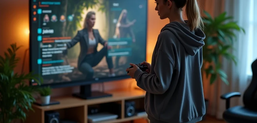 Femme en hoodie joue à un jeu avec un écran de build fantasy