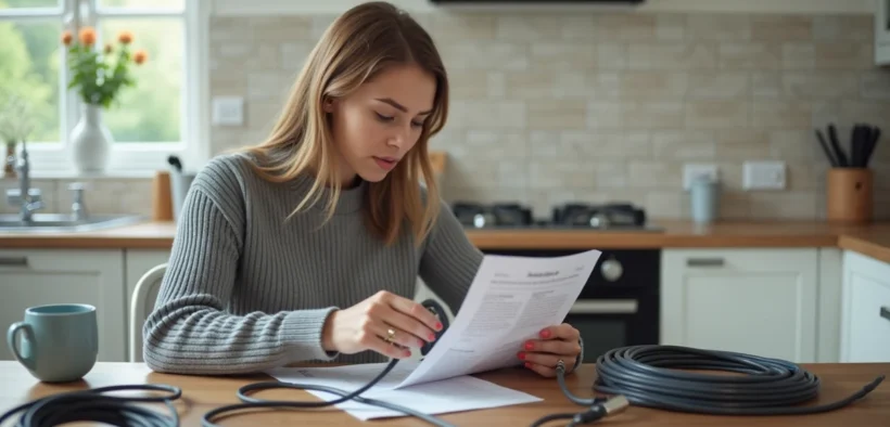 Jeune femme triant des câbles coaxiaux dans une cuisine lumineuse