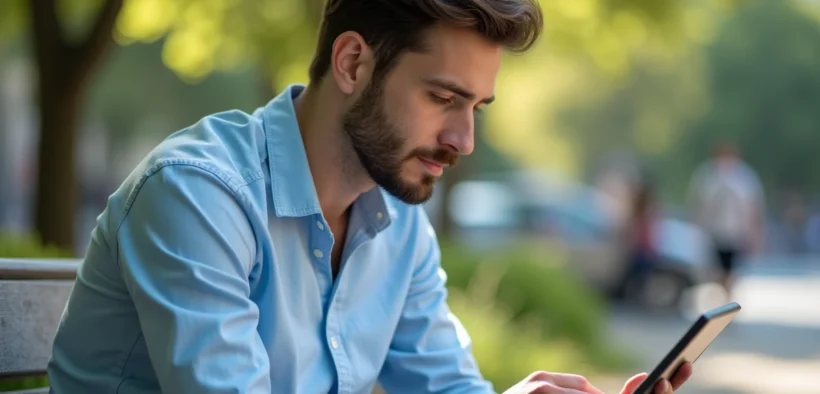 Jeune homme lisant une énigme de mots croises en extérieur