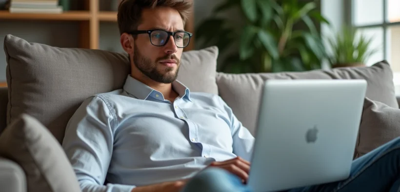 Jeune homme lisant des astuces Monopoly sur son ordinateur portable