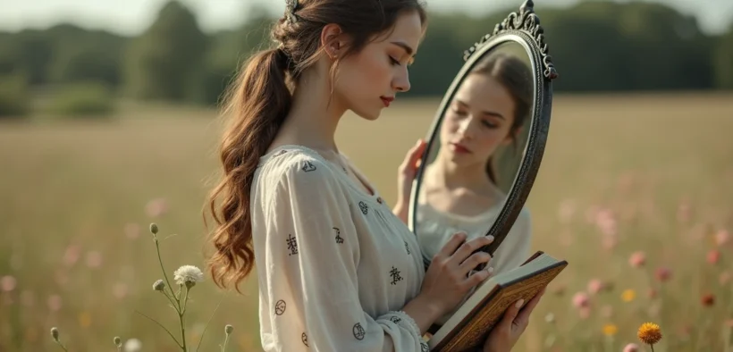 Jeune femme dans un champ de fleurs avec miroir et livre