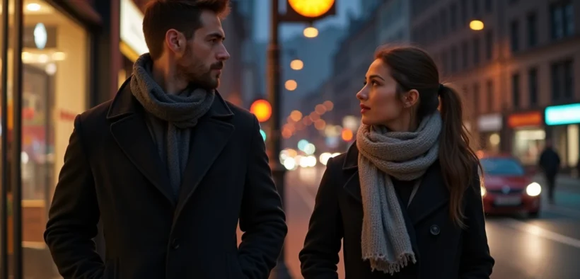 Homme et femme dans la ville la nuit regardant dans des directions opposées