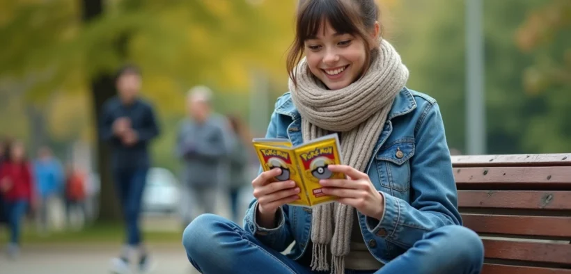 Jeune femme examinant un pack de cartes Pokémon dans un parc
