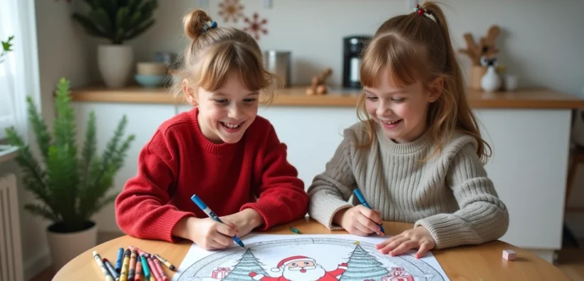 Enfants coloriant un dessin de Noël dans la cuisine