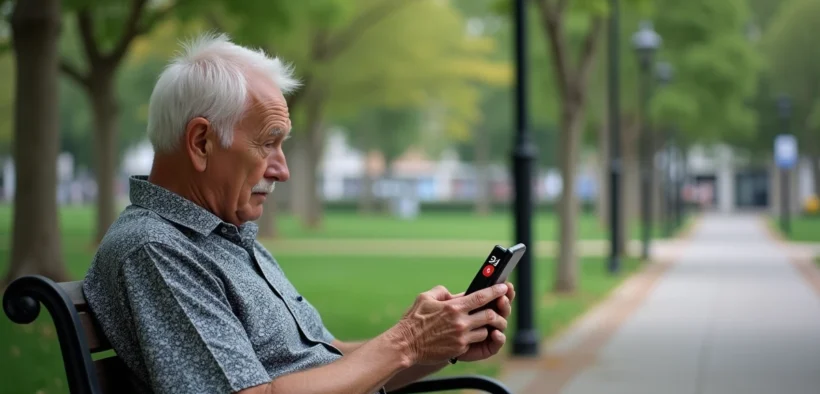 Homme âgé vérifiant son smartphone sur un banc de parc