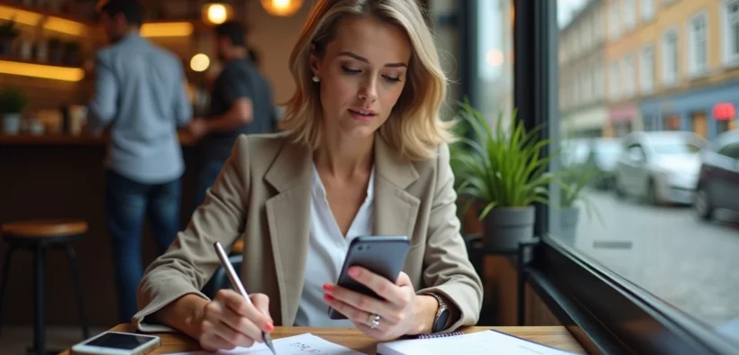 Femme vérifiant sa checklist dans un café animé