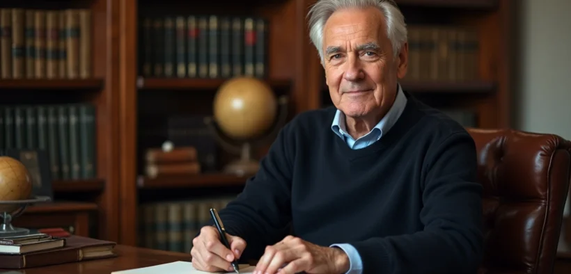 Homme âgé écrivant dans un carnet dans un bureau chaleureux