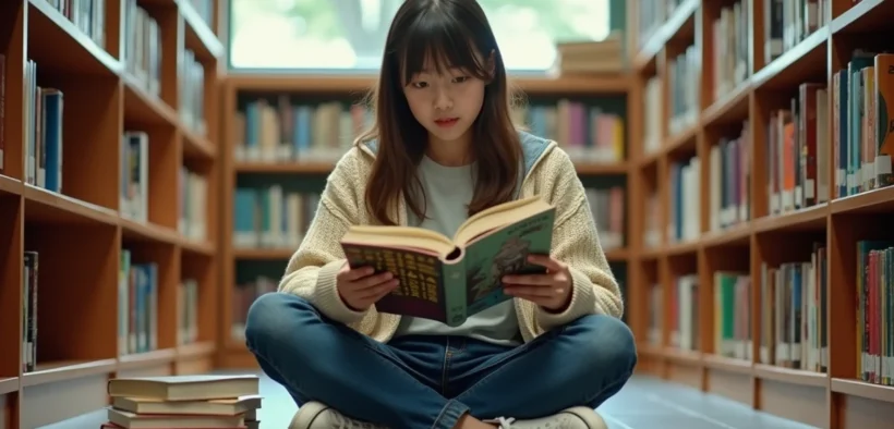 Une adolescente lisant des mangas dans une bibliothèque lumineuse