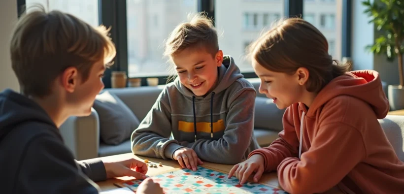 Adolescents jouant au Scrabble dans un appartement moderne