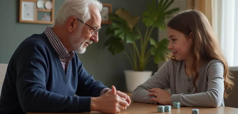 Grand-père expliquant les règles du jeu 421 à sa petite fille