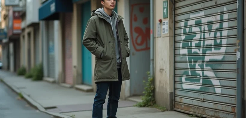 Jeune homme en windbreaker dans un secteur moins entretenu de Mille