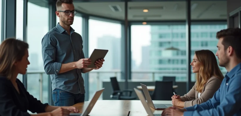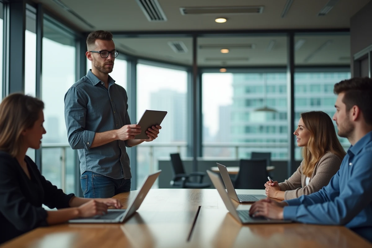 Homme montrant des fonctionnalités Scrben à ses collègues en réunion